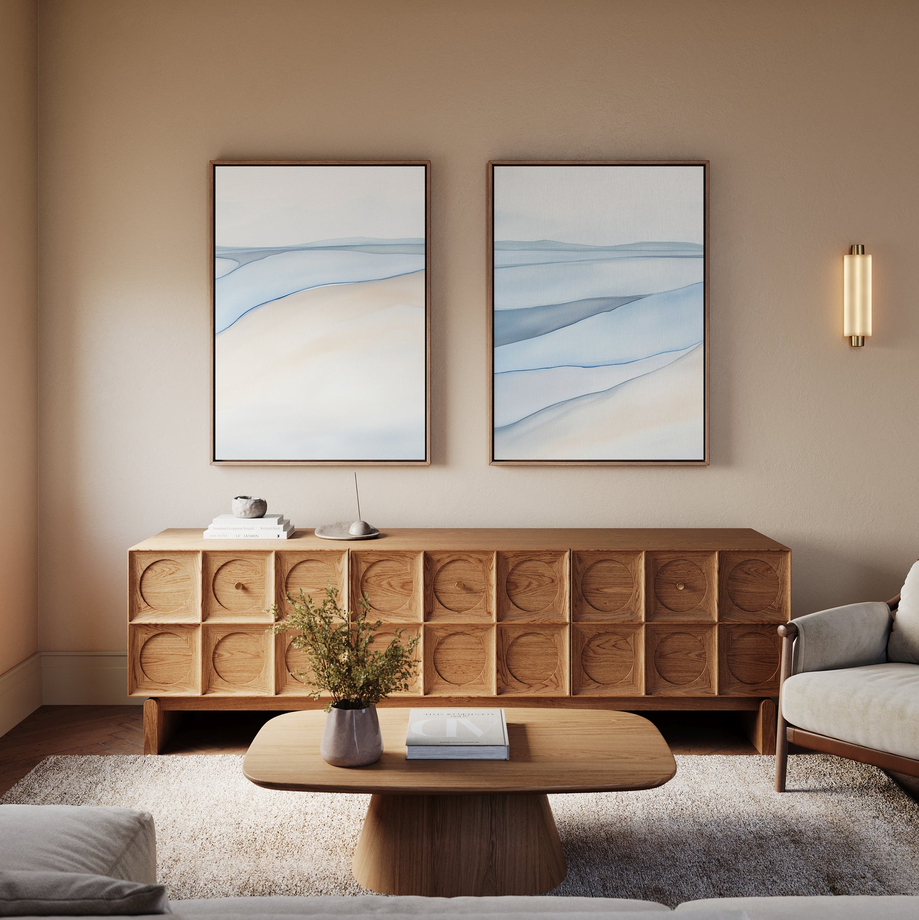 A modern living room featuring a wooden sideboard, Pale Currents - Set of 2 abstract canvas prints in blue and beige, a wooden coffee table with a plant and books, and a light gray sofa—ideal for your Nordic Park-inspired retreat.
