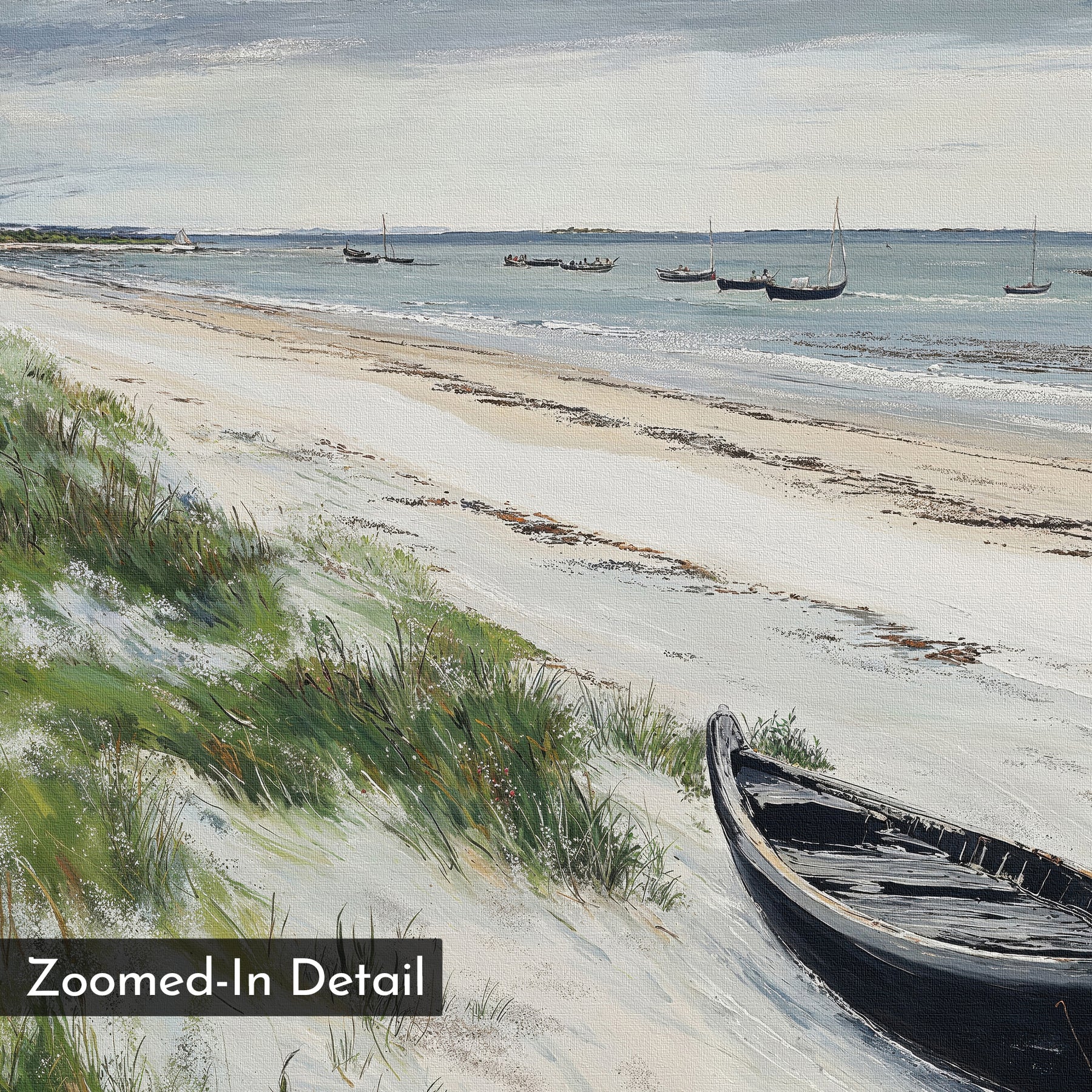 Zoomed-In Detail: Lonely Coast Canvas Art features a sandy beach with grassy dunes, a black wooden boat on the shore, and sailboats on calm blue water beneath a cloudy sky—perfect tranquil wall art.