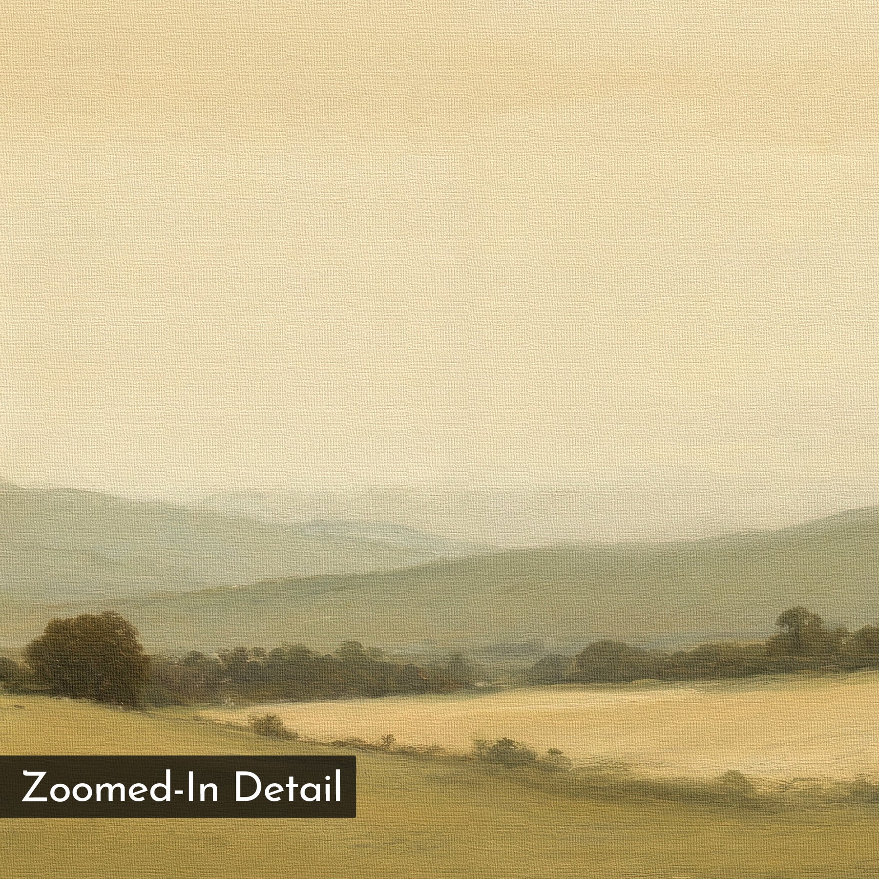 Quiet Countryside Canvas Art features a serene landscape with rolling hills, scattered trees, and soft beige-green tones beneath a hazy sky—minimalist wall decor that brings calm and tranquility to any space.