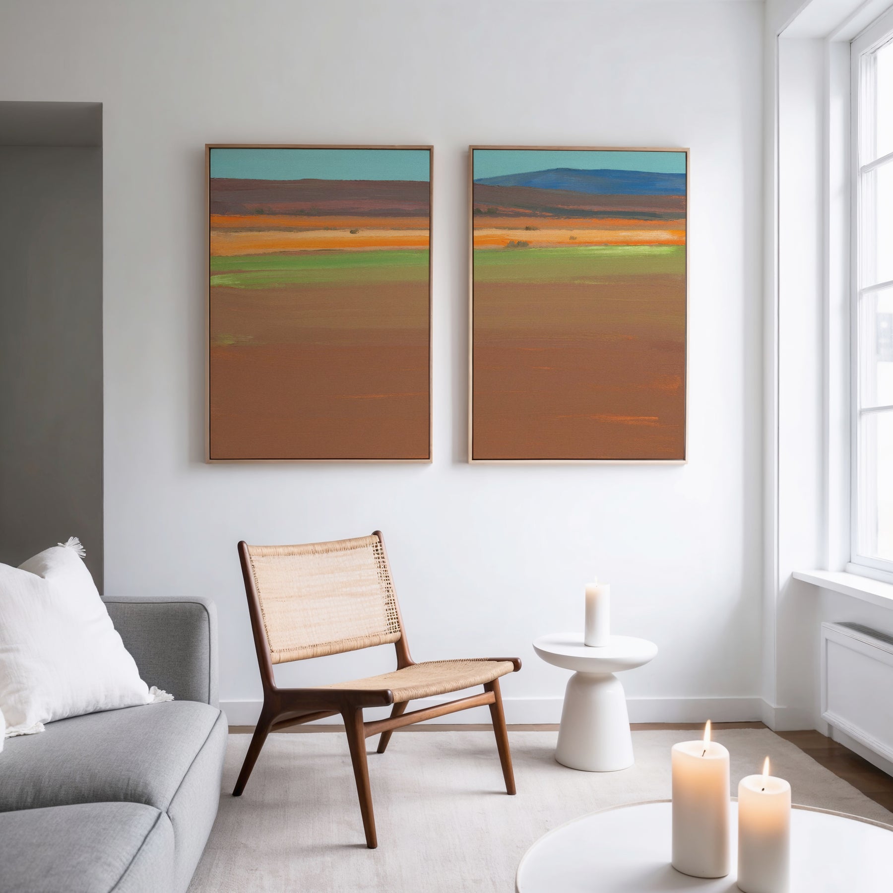 A modern living room with a gray sofa, wicker chair, and round white side table features three lit candles and the Desert Plains - Set of 2 colorful desert landscape canvas prints on a white wall. Natural light streams in from large windows.