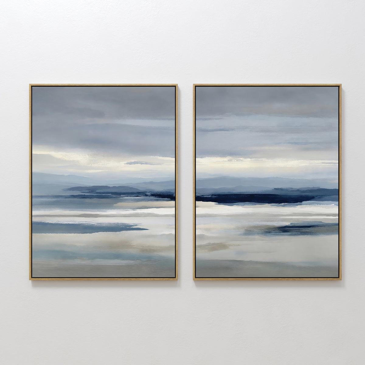 Add a serene touch to your home with Blue Mist Horizon Set of 2 by Nordic Park. This minimalist wall art print features a peaceful blend of soft greys, deep navy, and pale blue tones, evoking distant hills under a quiet sky. Perfect for living room decor or bedroom walls, this large print canvas creates a calming atmosphere.