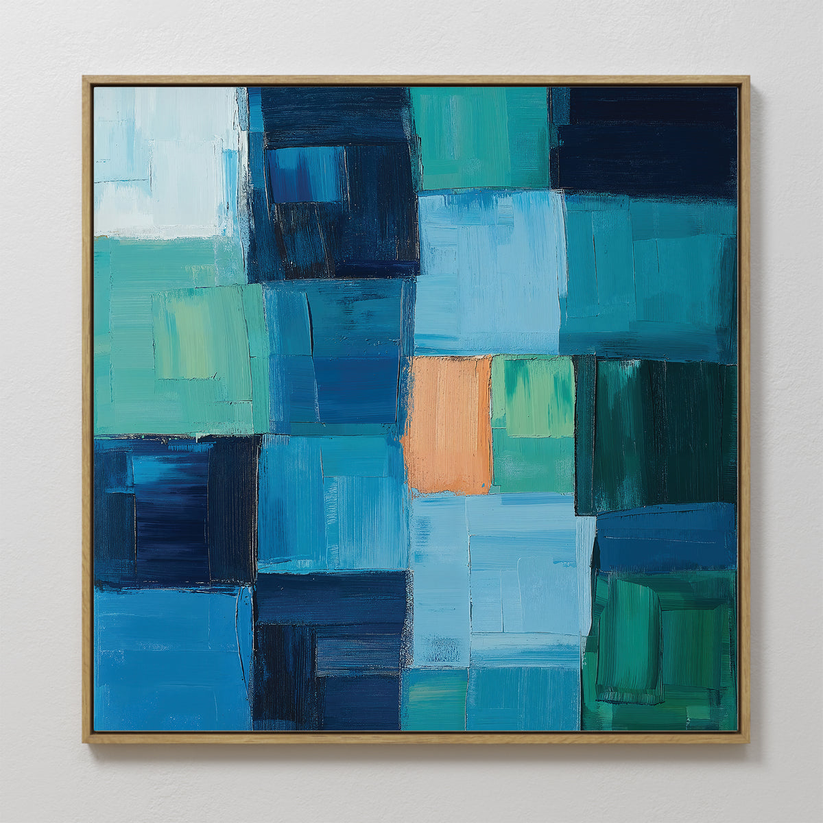 Discover 'Blue Mosaic' by Nordic Park, a vibrant wall art print featuring a patchwork of deep blues, turquoise, and subtle greens. This large wall art piece is perfect for adding a touch of bold color to your living room decor or bedroom decor. The geometric abstraction and rich color palette make it a standout piece in any contemporary space.