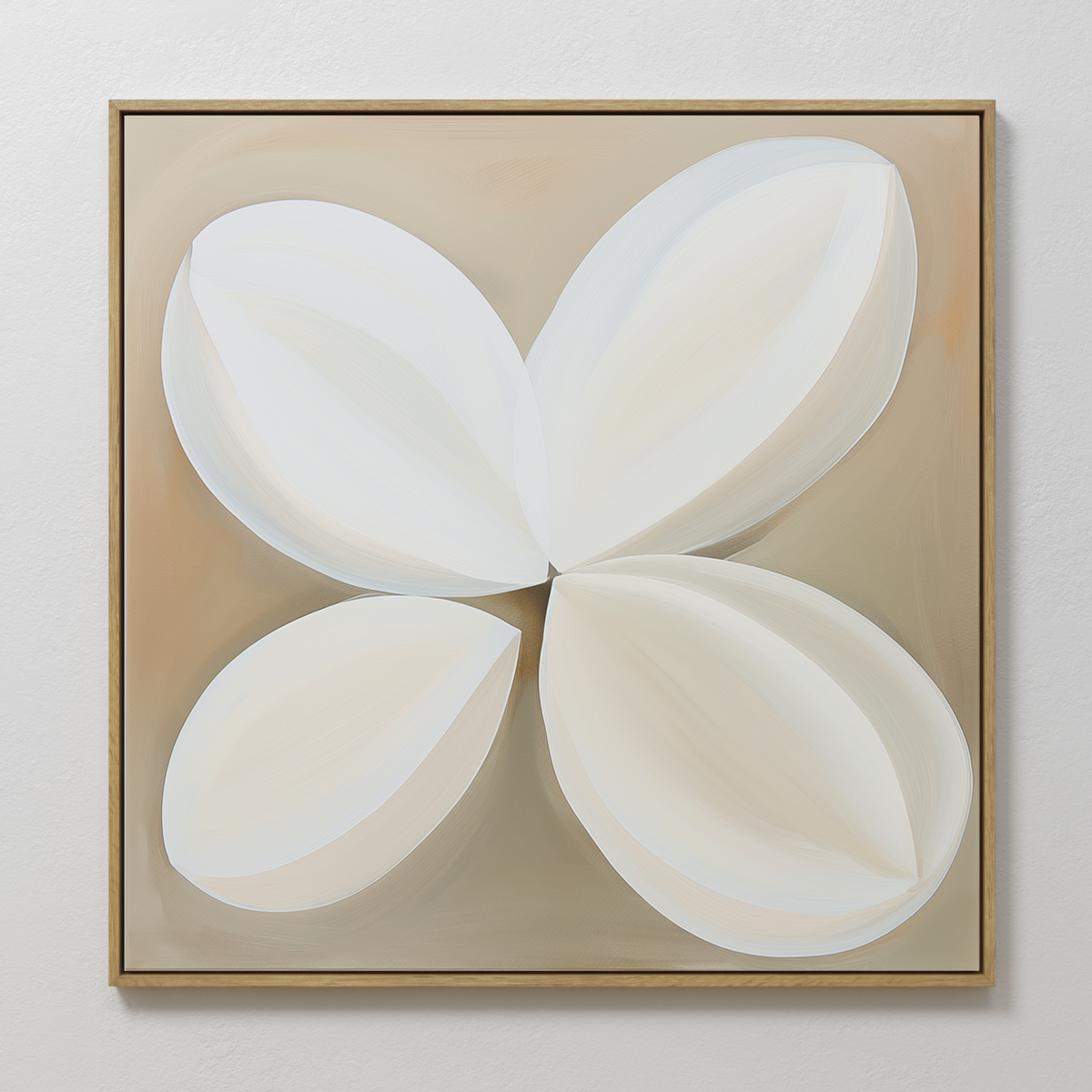 Discover 'Clover Harmony' by Nordic Park, a serene wall art print featuring soft white petals against a beige background. This minimalist wall art piece enhances living room decor or bedroom decor with its elegant and modern design, making it a stunning addition to any space.