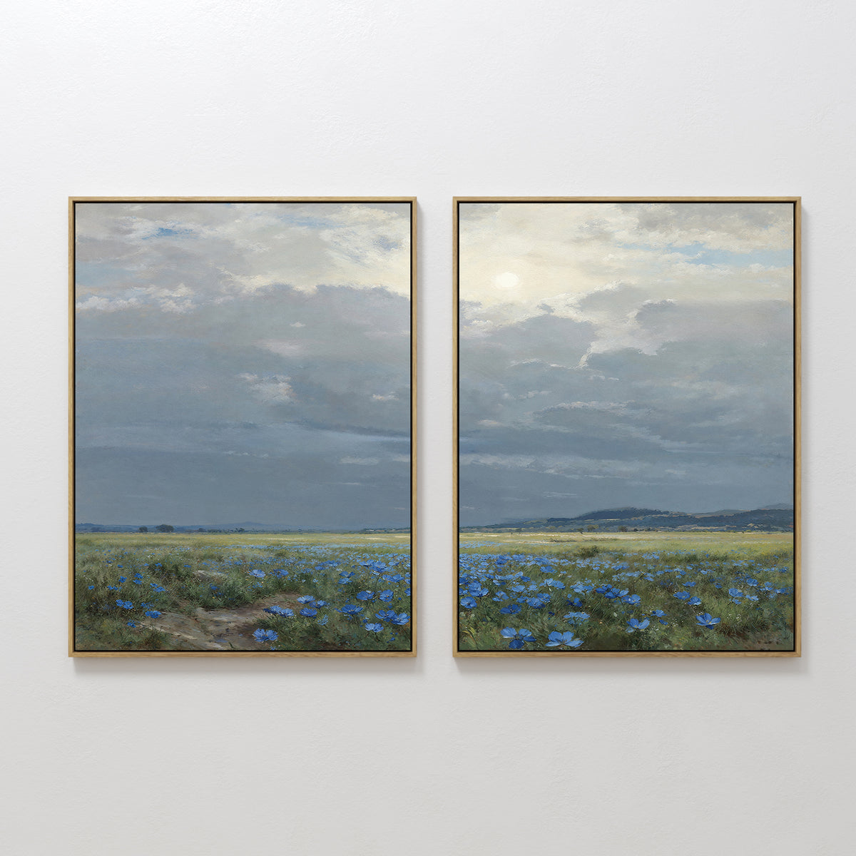 Cornflower Fields captures a sweeping meadow dotted with vibrant blue wildflowers beneath dramatic cloudy skies. This canvas print by Nordic Park features rich blues contrasting with golden-green grassland and soft gray storm clouds. The pastoral landscape brings natural tranquility to living rooms and bedrooms with its classic countryside charm.