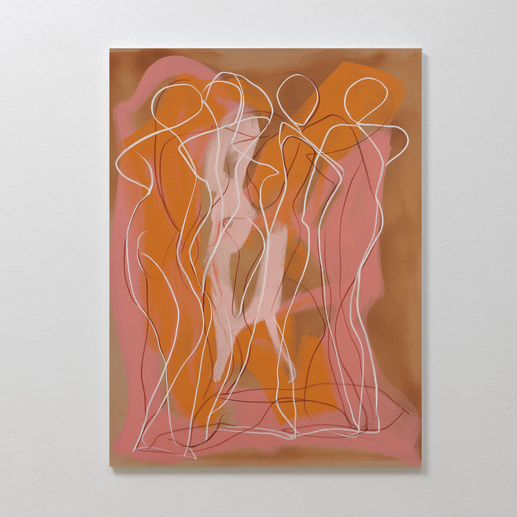 Dancing Silhouettes Abstract Canvas Art features four intertwined figures outlined in white, with pink, orange, and brown tones creating a warm vibe—ideal as modern wall art for stylish living room décor.