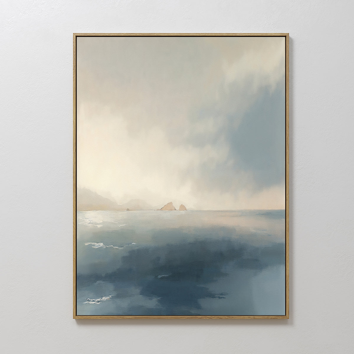 The Distant Isles Canvas Art - Vertical features a tranquil ocean with distant islands and a hazy sky in soft blues, grays, and whites—an ideal framed artwork to bring serene Nordic Park-inspired vibes to your space.