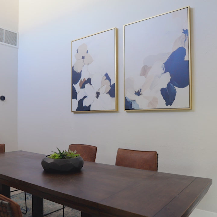 Enhance your living room decor with 'Floral Serenity Set of 2' by Nordic Park. This minimalist wall art set features delicate white and navy flowers on a beige background, creating a serene and elegant atmosphere. Perfect for adding a touch of modern wall art to your bedroom decor or any space needing a calming influence.