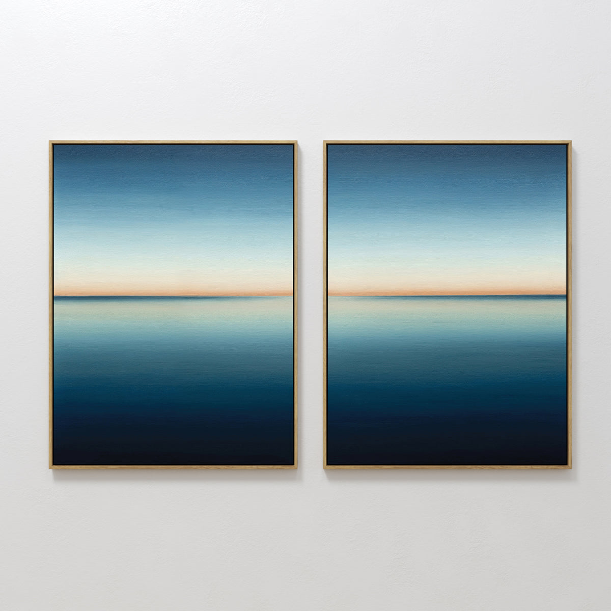 Indigo Passage Set of 2' by Nordic Park is a minimalist wall art print featuring a serene gradient of deep indigo, light blue, and a soft orange horizon. This large wall art piece evokes the calm of an endless ocean view, making it a perfect addition to modern living room or bedroom decor.