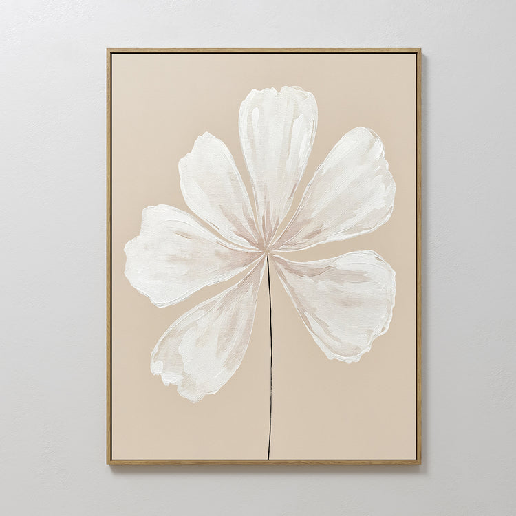 Ivory Bloom presents a delicate eight-petaled flower rendered in soft white and cream tones against a warm beige background. This minimalist canvas print by Nordic Park showcases subtle texture and organic form through gentle brushstrokes. The neutral palette and serene botanical design make it perfect for contemporary living rooms or peaceful bedrooms.