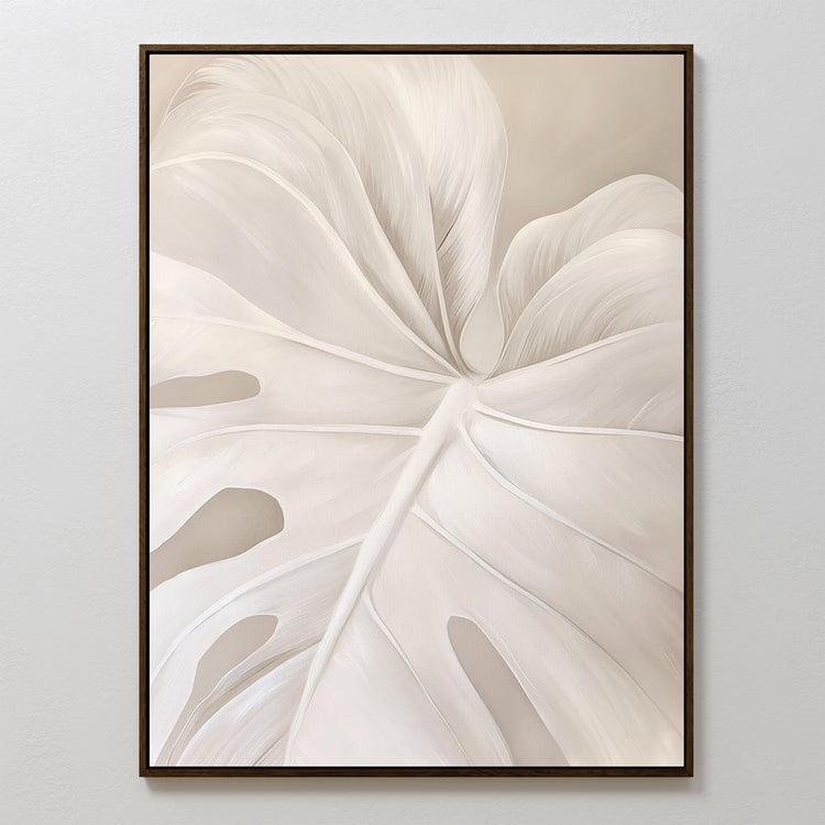 Leaf Whisper Abstract Canvas Art: A framed, minimalist wall art showcasing a close-up of a pale monstera leaf with soft textures and gentle shadows on a light beige background. Ideal for adding serene, Nordic Park-inspired style to your space.