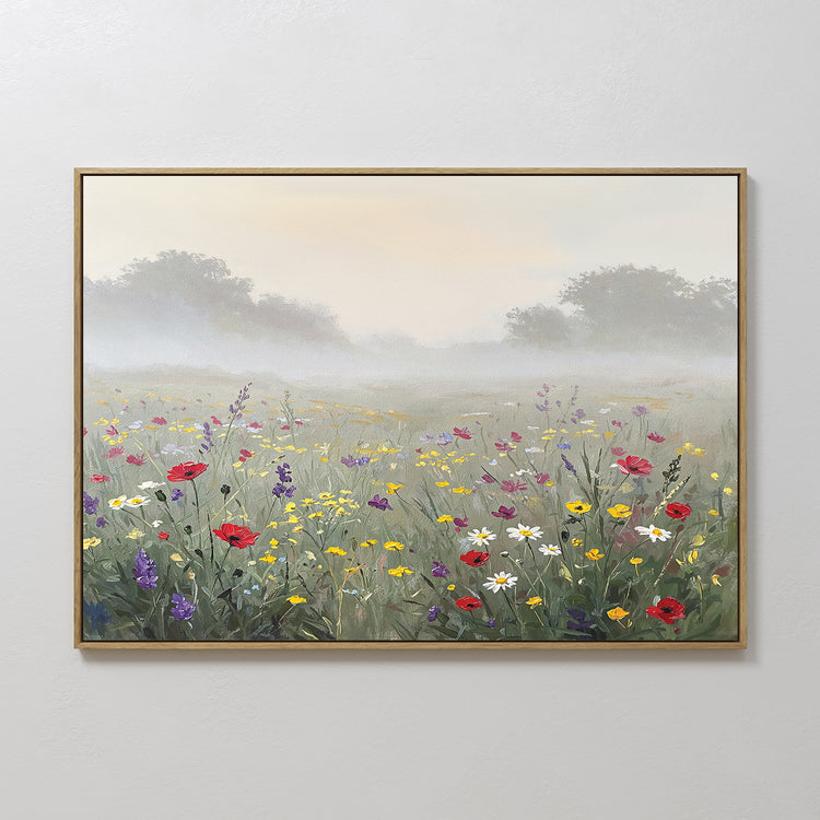 Meadow Dreams captures a wildflower field emerging from morning mist in this enchanting canvas print. Vibrant red poppies, white daisies, and purple lupines dance against soft sage greens and golden yellows, while misty grays create atmospheric depth. Perfect for living rooms or bedrooms seeking natural beauty by Nordic Park.