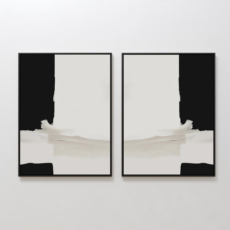 The Monochrome Harmony Set of 2 features bold black and cream framed minimalist wall art, hung side by side for a mirrored, symmetrical effect that adds striking modern style to any white wall.