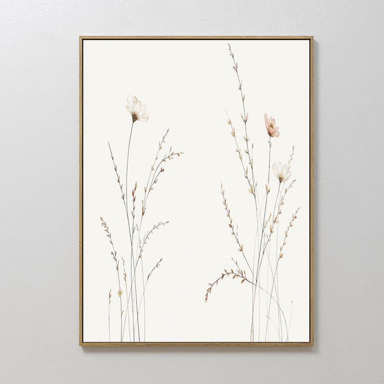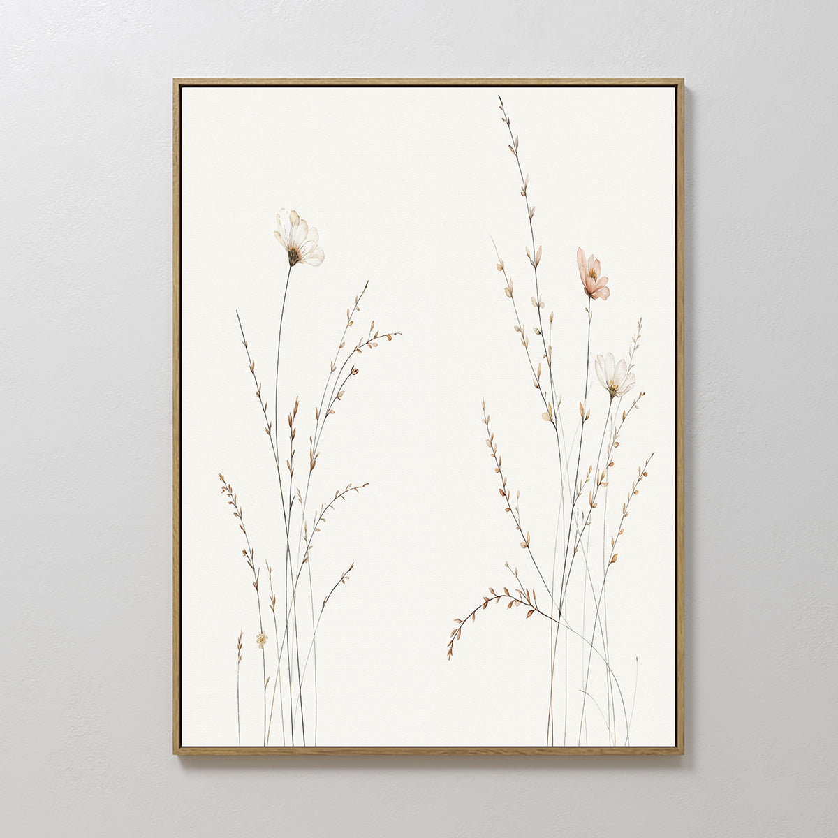 Prairie Whispers canvas print showcases delicate botanical elements rendered in soft, muted tones against a cream background. The artwork features graceful stems, tiny blooms, and wispy grasses in gentle browns and peachy hues. This serene composition brings natural tranquility to living rooms and bedrooms by Nordic Park.