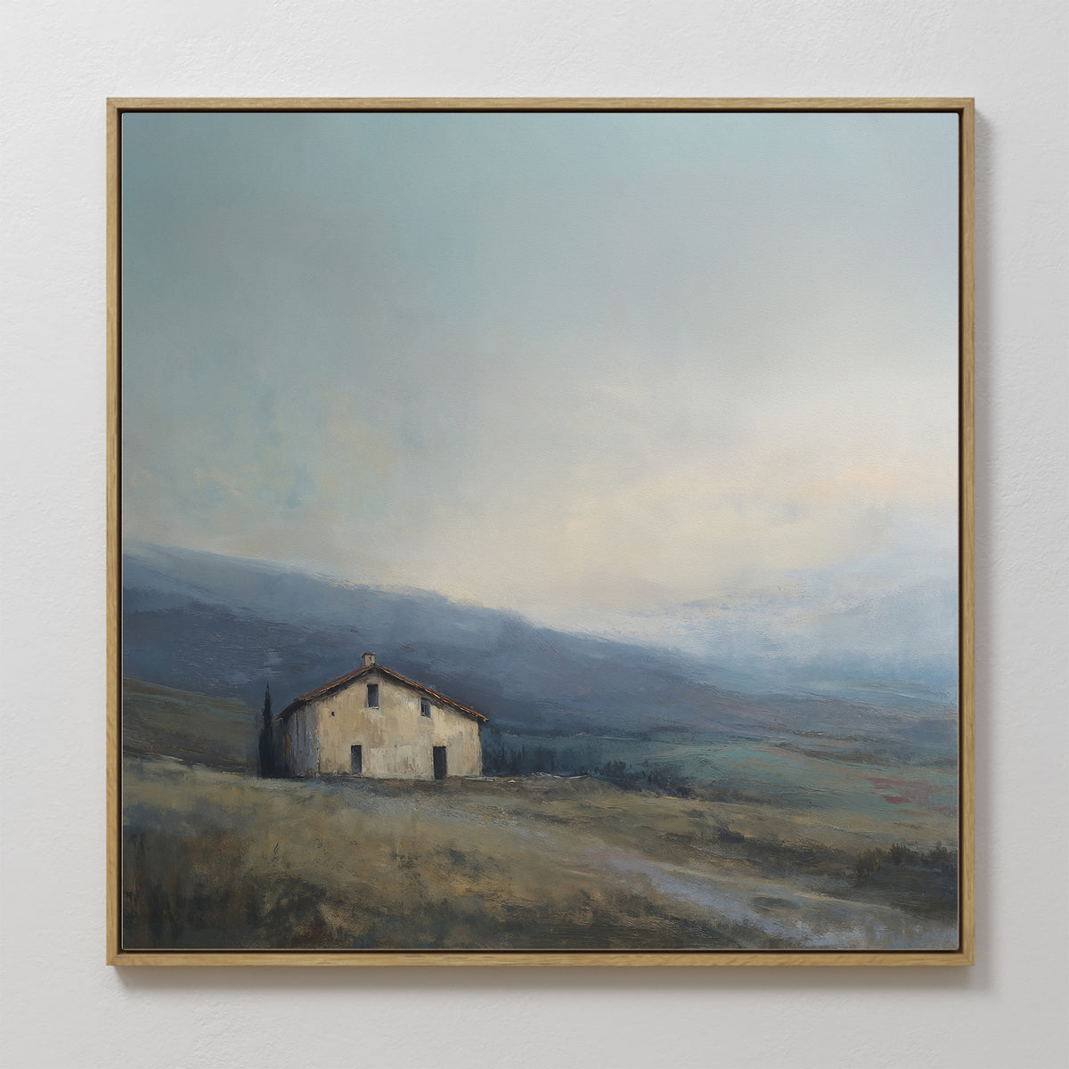Rustic Solitude captures the quiet beauty of a weathered farmhouse nestled in rolling countryside. This canvas print by Nordic Park features muted earth tones of sage green, warm beige, and soft blues that blend harmoniously across the misty landscape. Perfect for creating a serene atmosphere in living rooms or bedrooms seeking tranquil elegance.