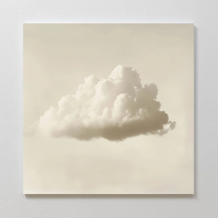 Singular Vapor Canvas Art: a minimalist framed wall piece showcasing a single fluffy white cloud on a soft beige background—perfect for bringing calm to modern interiors or as soothing bedroom decor.